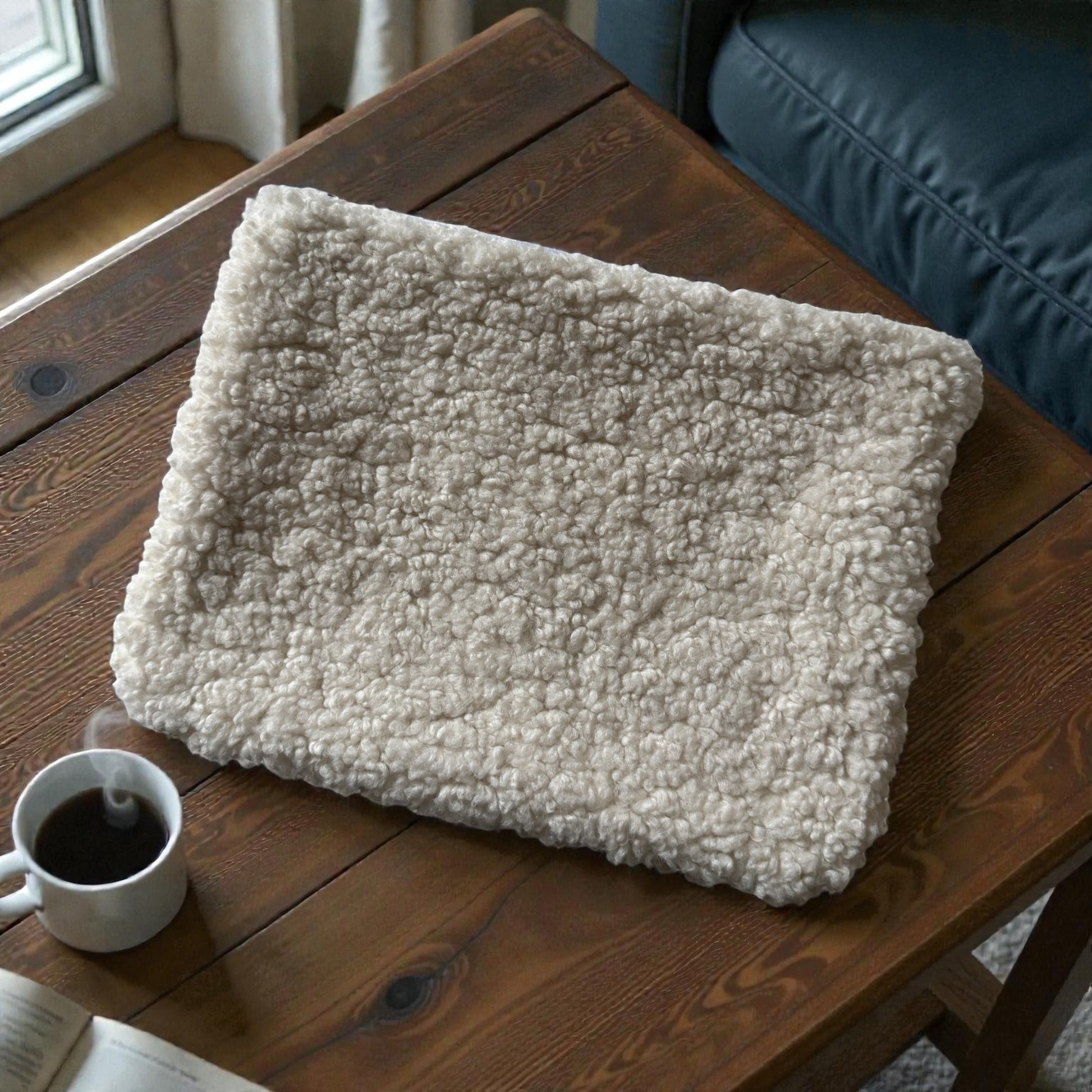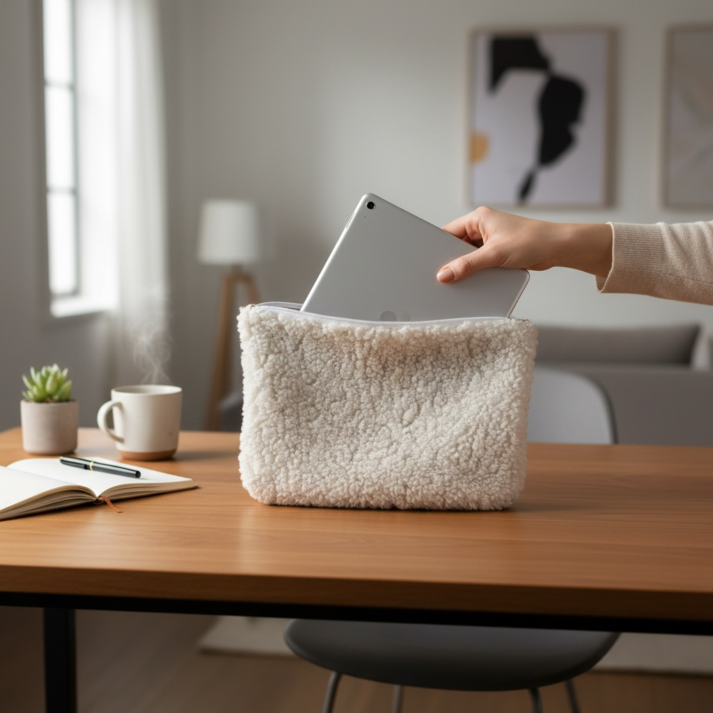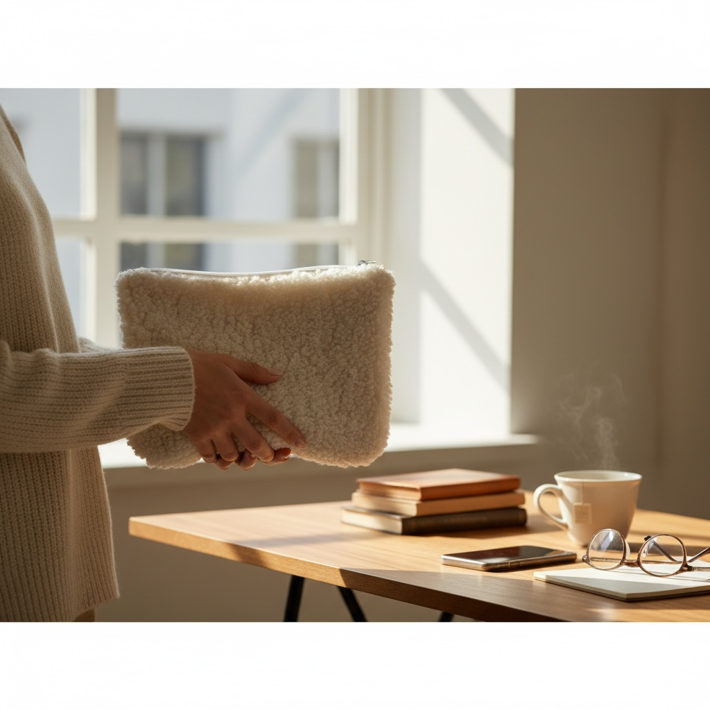 Fabriquée à la main partir de tissu bouclette ultra doux, elle se distingue par son format pratique et sa fermeture éclair blanche.